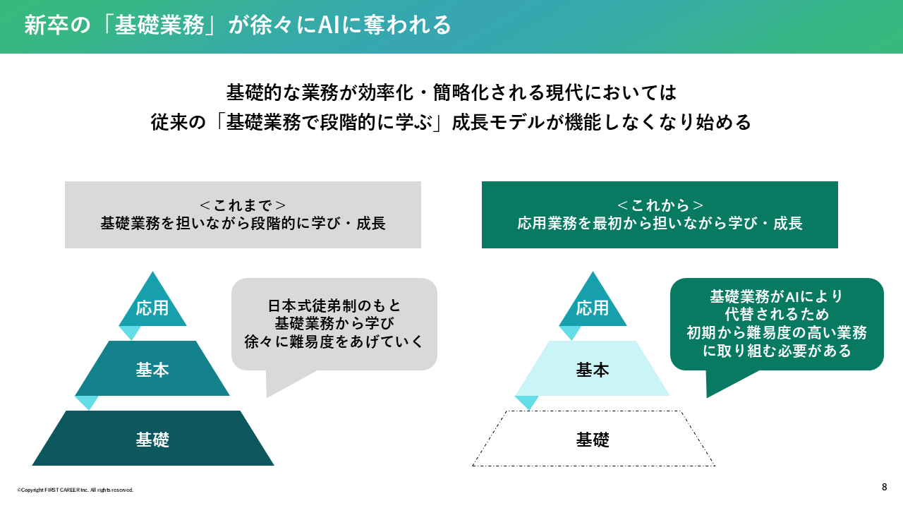 AIが事業現場に導入されることに伴い、若手社員が経験を積む場として機能してきた「基礎業務」が、いま最も急速にAIに置き換わっているという声をよく伺います。