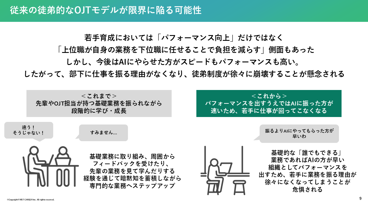 そのうえで懸念されるのは、今後OJT担当者や上司が若手に仕事を振る理由そのものが失われる可能性があることです。